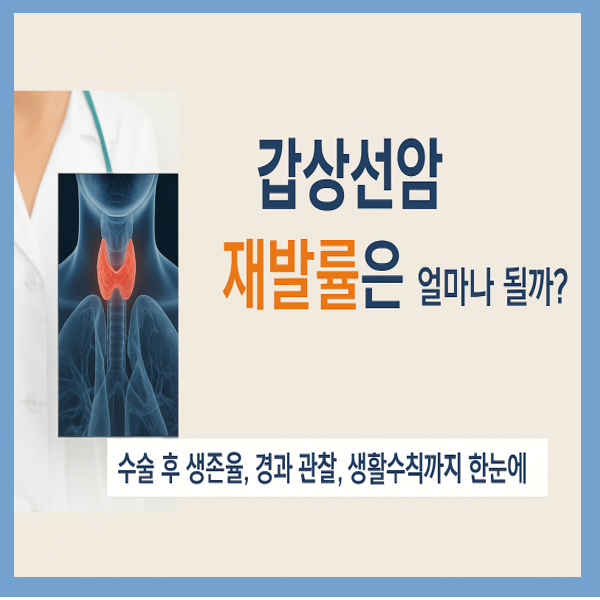 갑상선암 재발률은 얼마나 될까?수술 후 생존율, 경과 관찰, 생활수칙까지 한눈에!“갑상선암은 착한 암이라던데, 수술만 잘하면 끝나는 거 아닌가요?”갑상선암 진단을 받으면 많은 환자들이 이와 비슷한 말을 듣곤 합니다.실제로 갑상선암은 다른 암에 비해 진행 속도가 느리고 생존율도 높아 ‘예후가 좋은 암’으로 분류됩니다.그러나 ‘착하다’는 말만 믿고 경계를 늦추기엔 재발이라는 변수가 존재합니다.특히 갑상선암은 수술 후 수년이 지난 뒤에도 다시 나타날 수 있어,완치가 아니라 관리가 중요한 암이라는 점을 반드시 기억해야 합니다.이 글에서는 갑상선암 수술 후의 재발 가능성, 생존율, 그리고 꼭 알아야 할 관리법까지,환자와 보호자가 꼭 알아야 할 내용을 정리해드립니다.갑상선암과의 싸움, 수술 이후가 진짜 시작입니다...