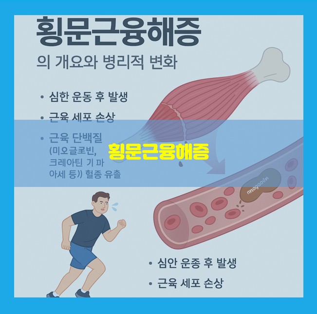횡문근융해증(Rhabdomyolysis) 질환 개요정의: 골격근이 손상되며 근세포 내 단백질(미오글로빈, 크레아틴 키나아제 등)이 혈액으로 유출되는 질환.주요 원인: 과도한 고강도 운동, 탈수, 충분하지 않은 회복 등이 근육 손상을 유발.주요 원인고강도 운동: 웨이트 트레이닝, 크로스핏, 마라톤 등무리한 근력 운동: 준비 없이 과도한 중량 사용회복 부족: 휴식 없이 반복 운동탈수: 수분 섭취 부족 시 위험 증가지속적 근육 수축: 장시간 강도 높은 운동극한 환경: 무더위·한랭 속 운동전해질 불균형: 칼륨, 나트륨, 칼슘 부족주요 증상근육 관련심한 근육통 (전신적)근육 경직, 부종근력 저하근육 경련소변·신장 관련콜라색 소변 (미오글로빈 배출)소변량 감소급성 신부전 가능성전신 증상피로감, 무기력메스꺼움, 구토..