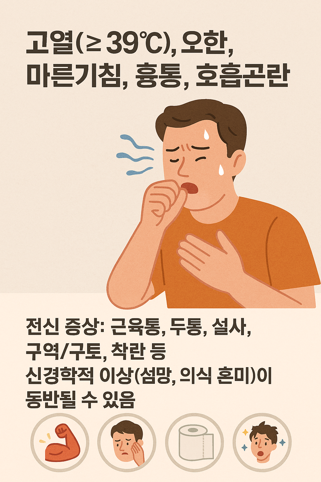 - 전신 증상: 근육통, 두통, 설사, 구역/구토, 착란 등
