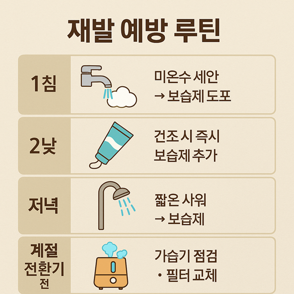 아토피 피부염은 완치가 어렵지만 꾸준한 보습, 환경 관리, 자극 회피로 증상 조절이 가능합니다. 자신만의 악화 요인을 파악하고, 계절별 대응 전략을 세우는 것이 재발을 막는 가장 확실한 방법입니다.