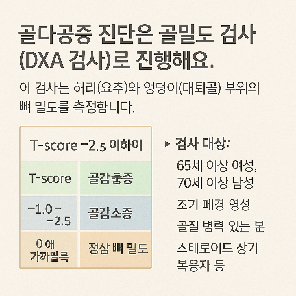 골다공증 진단은 **골밀도 검사(DXA 검사)**로 진행해요.