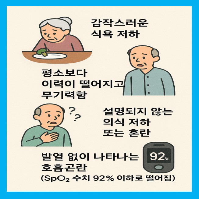 노인의 경우 신체 기능과 면역 반응이 저하되면서 폐렴에 걸려도 염증 반응이 약하거나 기침 반사가 둔화되는 경우가 많습니다. 뇌졸중 후유증이나 인지기능 저하(치매 등)로 인해 증상을 호소하지 못하거나 감지하지 못하는 경우도 흔합니다.