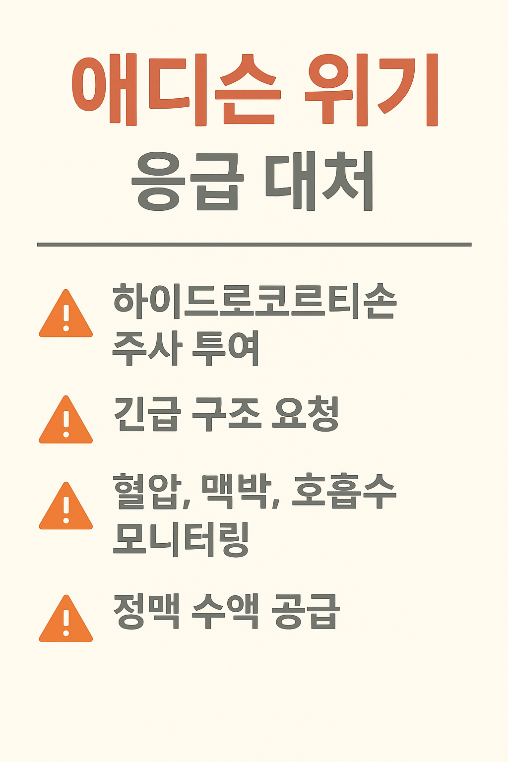 | 응급카드/팔찌 착용 | “나는 Addison병 환자입니다. 스테로이드 투여가 필요합니다” 문구 기재 |