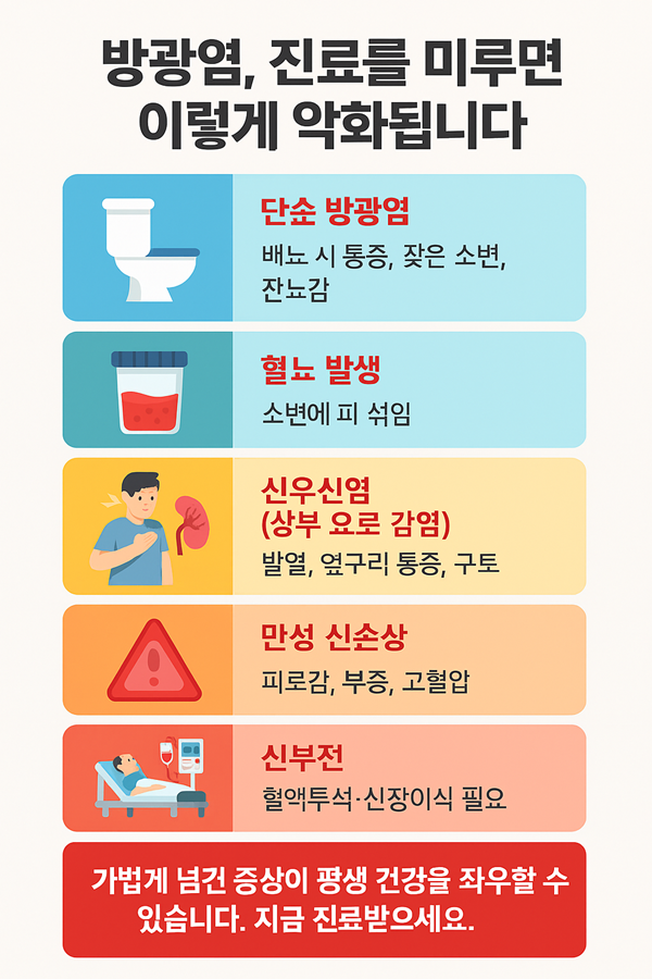 이번 글에서는 진료를 미뤘을 때 나타날 수 있는 단계별 악화 과정을 살펴보고, 방광염·혈뇨·전립선비대증이 신부전까지 이어질 수 있는 위험성을 강조해 드리겠습니다.