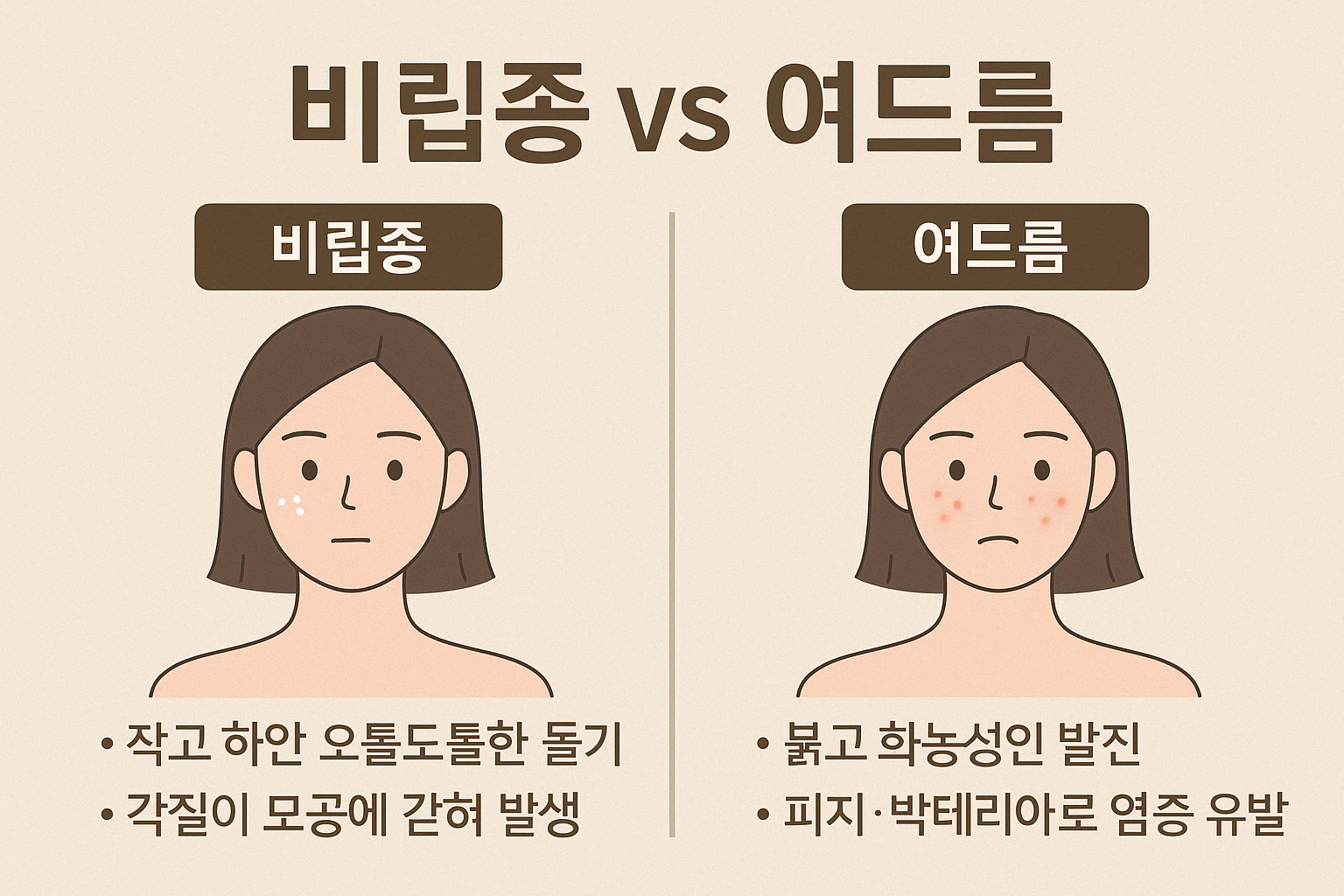 | 🔄 재발 가능성 | 있음 (각질 관리 부족 시 반복 발생) | 있음 (피지 조절이 안 될 경우 반복) |