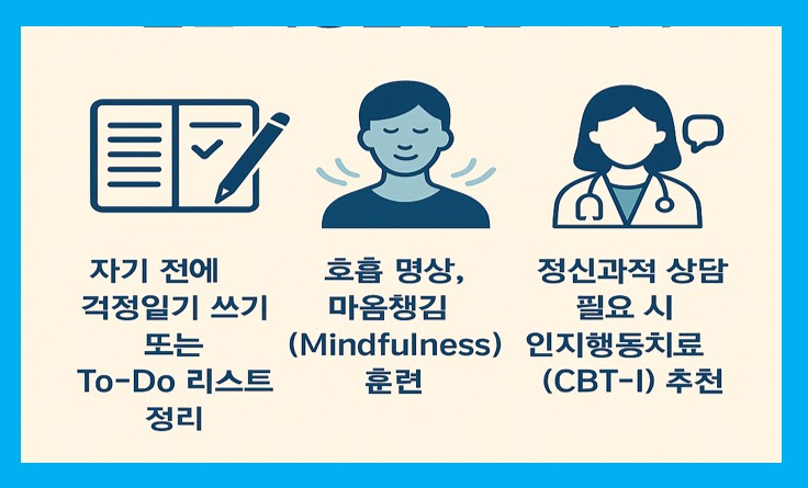 - 정신과적 상담 필요 시 인지행동치료(CBT-I) 추천