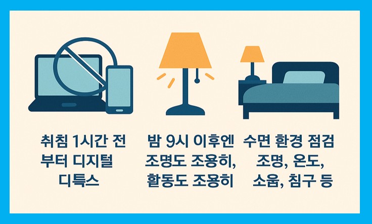 - 수면 환경 점검: 조명, 온도, 소음, 침구 등