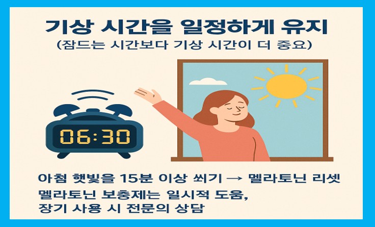 - 기상 시간을 일정하게 유지 (잠드는 시간보다 기상 시간이 더 중요)