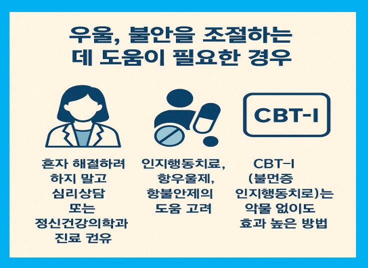 - 정신과적 상담 필요 시 인지행동치료(CBT-I) 추천