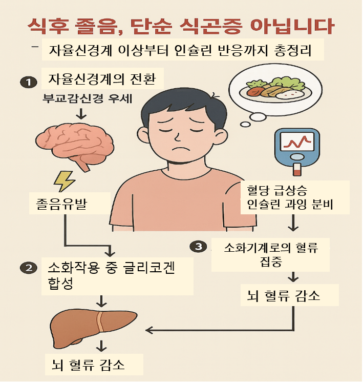 식사 후 졸음은 단순한 피로로 넘기기 쉽지만, 몸 속 이상을 경고하는 신호일 수 있습니다. 특히 자율신경계의 균형이 깨졌거나, 인슐린 반응이 과도하거나, 간 기능에 이상이 있을 경우 식곤증은 더 심해지고 반복됩니다.