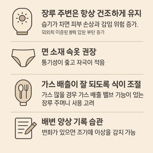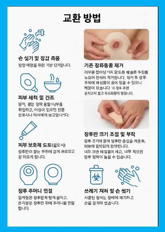 - 장루판 교체 주기: 일반적으로 3~7일에 한 번, 피부 상태나 제품에 따라 조절.