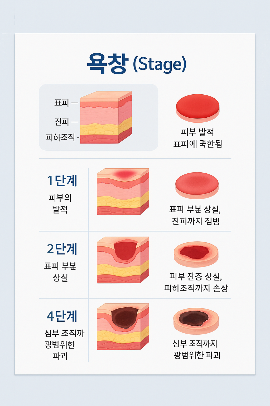 - 1단계는 피부 빨개짐, 2~4단계는 피부 궤양, 감염까지 진행