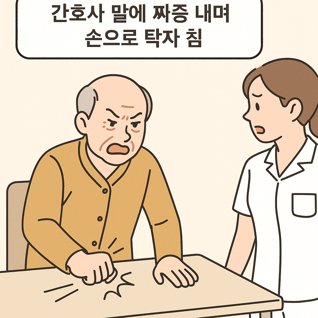 - "간호사 말에 짜증 내며 손으로 탁자 침"