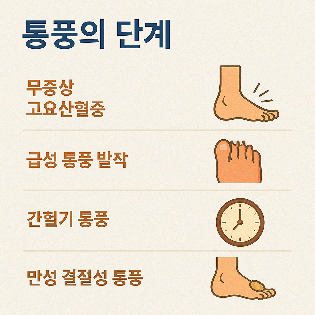 통풍은 보통 다음과 같은 단계로 진행됩니다: