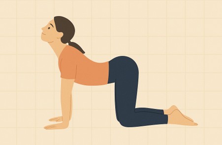 - 숨을 들이마시며 등을 아래로 눌러 아치형으로 만듭니다(소 자세).