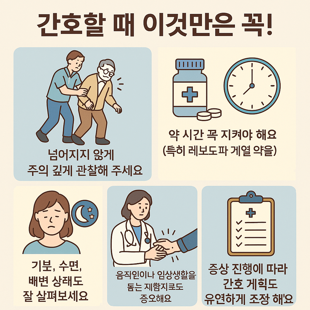그래서 시간이 지나면 움직임뿐 아니라 기분, 기억력, 배변·배뇨 문제까지 다양하게 나타날 수 있어요.