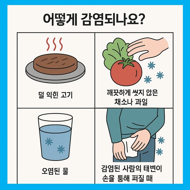 | 원인 | 덜 익힌 고기, 씻지 않은 채소, 오염된 물 |