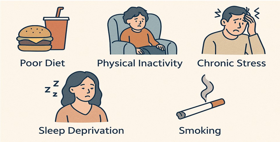불규칙한 식습관, 가공식품 위주의 식사, 흡연, 음주는 활성산소를 증가시켜 세포에 손상을 주고, 만성 염증을 만들어 노화를 앞당깁니다.