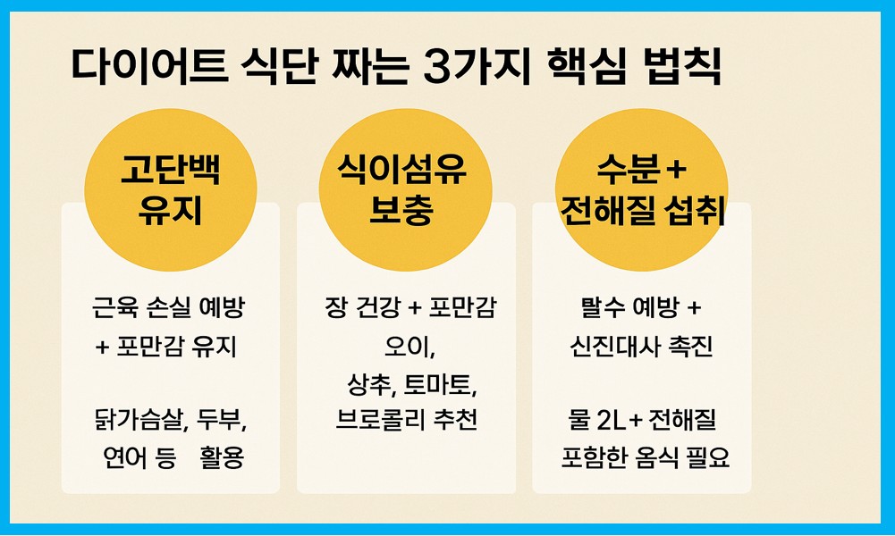 | 1. 고단백 유지 | 근육 손실 예방 + 포만감 유지. 닭가슴살, 두부, 계란, 연어 등 활용 |