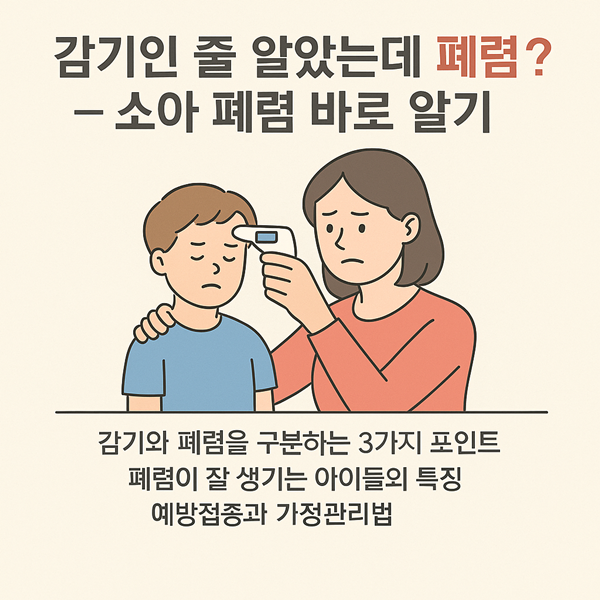 소아 폐렴은 발열 지속·호흡 변화·전신 상태 악화가 핵심 신호입니다. 조기 진단과 치료, 그리고 예방접종과 생활관리로 아이의 합병증을 줄일 수 있습니다.
