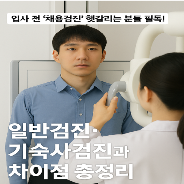 입사 전 ‘채용검진’ 헷갈리는 분들 필독!일반검진·기숙사검진과 차이점 총정리“채용검진이요? 일반건강검진이랑 뭐가 다르죠?”“기숙사 입소 전에 건강검진 받으라는데, 이미 했던 거 제출하면 안 되나요?”입사나 기숙사 입소를 앞둔 분들에게 꼭 필요한 정보!**‘채용검진’, ‘일반건강검진’, ‘기숙사 입소 전 검진’**은 모두 건강 상태를 점검한다는 공통점이 있지만, 검사 목적과 결과 활용 방식은 전혀 다릅니다.이번 글에서는 세 가지 검진의 차이점과 준비 시 유의할 점을 한눈에 정리해드립니다.🔍 세 가지 건강검진 비교표항목채용검진 일반건강검진 기숙사입소 검진목적입사자 건강 적합성 판단질병 조기 발견 및 예방공동생활 가능 여부 확인대상입사 예정자만 20세 이상 국민대학생, 기숙사 입소 예정자결과 활용회사 제출 ..