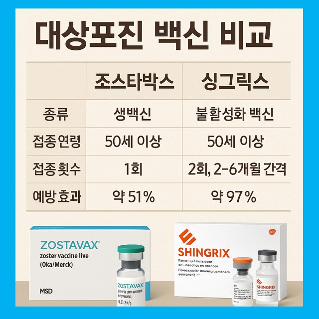 1.대상포진 백신 비교표 (상세 정리) 구분 조스타박스 (Zostavax)싱그릭스 (Shingrix)백신 종류생백신 (약독화된 살아있는 바이러스)재조합 불활성화 백신 (바이러스 단백질 + 보조제 포함)제조사MSD (Merck & Co.)GSK (GlaxoSmithKline)승인 연령50세 이상 건강한 성인50세 이상 건강한 성인 및 면역저하자 (18세 이상 포함)접종 횟수1회 접종2회 접종 (2~6개월 간격)접종 방법피하주사(SQ), 상완 삼각근 부위근육주사(IM), 상완 삼각근 부위백신 성분살아있는 수두-대상포진 바이러스VZV 단백질(gE) + AS01B 보조제예방 효과약 51% (60세 이상), 연령 증가 시 효과 감소약 90% 이상 (연령 상관없이 효과 우수)대상포진 후 신경통 예방효과 (PHN)..