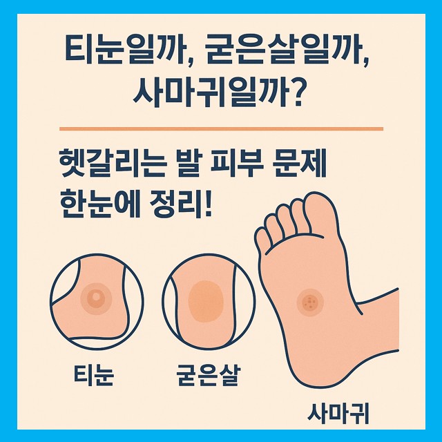👣 “티눈일까, 굳은살일까, 사마귀일까?” 헷갈리는 발 피부 문제 한눈에 정리!발바닥이나 발가락에 생긴 딱딱한 혹이나 각질,“이게 그냥 굳은살인지, 티눈인지, 혹시 사마귀인지…”혼자서는 구분하기 어렵고 헷갈릴 때 많죠.겉보기엔 비슷해 보여도 원인, 통증, 치료법은 모두 다릅니다.이 글 하나로, 세 가지를 명확히 구분해보세요.1. 증상별 핵심 비교 요약 구분 티눈 (CORN) 굳은살 (CALLUS) 사마귀 (WART) 원인반복되는 압력과 마찰반복되는 마찰HPV 바이러스 감염위치뼈 돌출 부위, 발가락 사이발뒤꿈치, 발바닥 넓은 부위발바닥, 손바닥 등 어디든 가능모양작고 둥글며 중심에 딱딱한 ‘핵’ 있음넓고 평평한 두꺼운 각질층표면 거칠고, 중심에 검은 점 다수통증❗압박 시 찌릿한 통증거의 없음❗눌..
