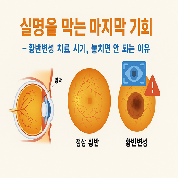“실명을 막는 마지막 기회” – 황반변성 치료 시기, 놓치면 안 되는 이유 중심 시야, 지금도 선명하신가요?요즘 들어 글씨가 흐릿하거나, 책을 오래 보면 피로감이 심해지고,사람 얼굴이 뿌옇게 보이거나 중심이 어두워지는 느낌을 받지는 않으셨나요?“노안인가 보다…” 하고 그냥 넘기셨다면, 지금이 경고등이 켜진 순간일지도 모릅니다.이 증상, 단순한 노안이 아닌 황반변성의 초기 신호일 수 있습니다. 황반변성이란?황반변성은 망막 중심에 위치한 ‘황반’ 부위가 손상되면서 시력이 점차 저하되는 질환입니다.황반은 글자 인식, 얼굴 구별, 색감 표현 등 가장 세밀한 시력을 담당하는 부위로,여기에 이상이 생기면 중심 시야 자체가 왜곡되거나, 심하면 사라지기도 합니다.특히 50대 이후 중장년층에서 빈도가 급격히 증가하며,..