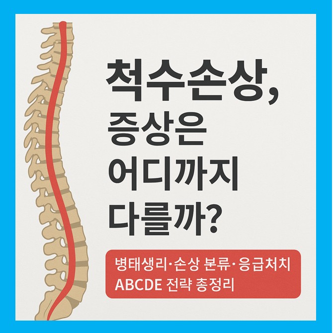 🧠 척수손상, 증상은 어디까지 다를까?병태생리 · 손상 분류 · 응급처치 ABCDE 전략 총정리갑작스러운 교통사고나 높은 곳에서 떨어지는 사고로 인해 몸이 움직이지 않거나 감각이 사라진다면, 가장 먼저 의심해야 할 것은 척수손상입니다.척수는 우리 몸의 ‘신경 고속도로’ 역할을 하는 기관으로, 이곳에 손상이 생기면 단순한 골절과는 다른 심각한 마비, 감각 소실, 배뇨장애 등이 발생합니다.이번 글에서는 척수손상이 왜 무서운지, 손상 부위에 따라 증상이 어떻게 달라지는지, 응급상황에서 어떤 처치를 해야 하는지를 쉽고 정확하게 정리해 드릴게요.1. 척수손상이란?척수는 뇌에서 척추를 따라 내려오는 중추신경계의 일부입니다. 팔과 다리, 장기까지 모든 감각과 움직임을 지휘하죠.하지만 이 신경줄기는 골절, 충격, 압..